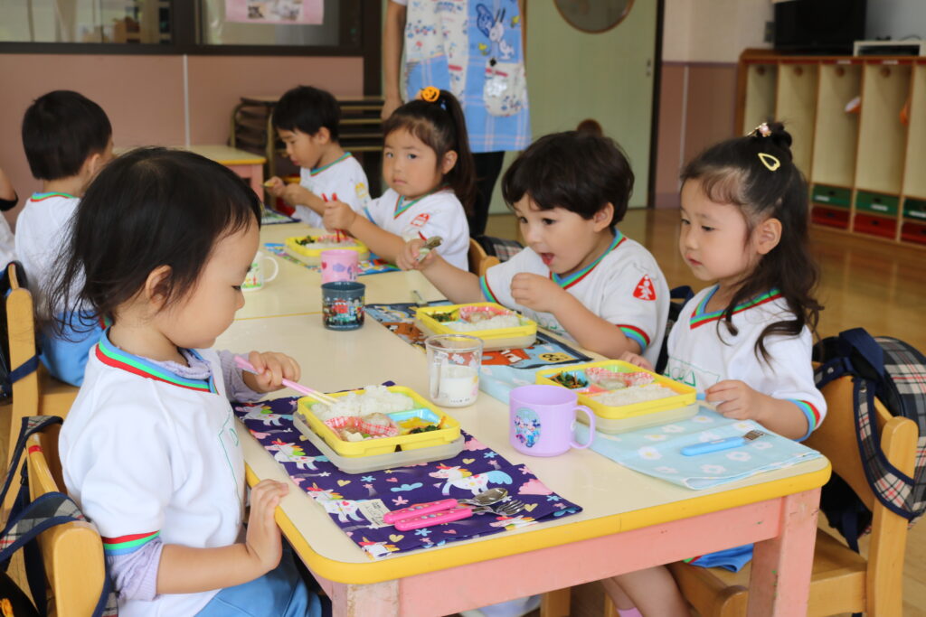 最初は慣らし保育(11:30降園)でしたが、少しづつ幼稚園に慣れ始め、今は給食(昼食)をクラスのお友達と一緒に食べ、