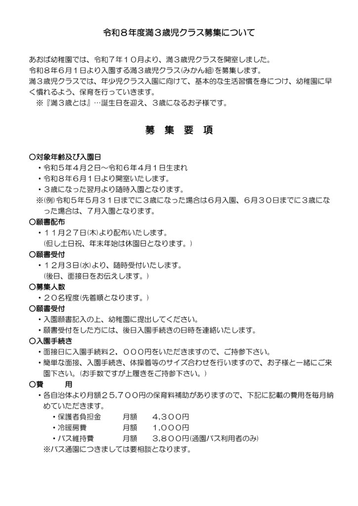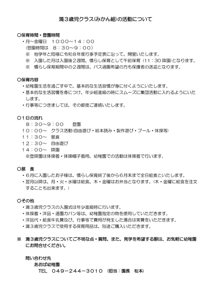 あおば幼稚園では、令和7年10月より開設した満3歳児クラス(みかん組)の令和8年度入園児を募集いたします。